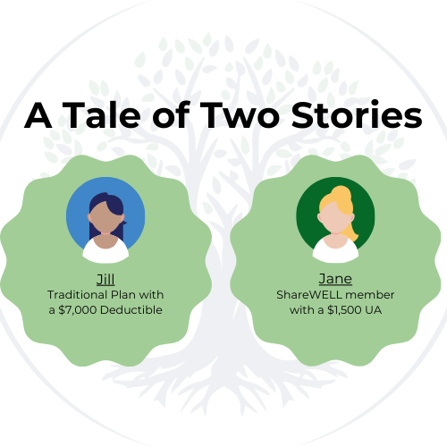 Jane, on the other hand, had a different experience. Her surgery and recovery services were also significant, but with ShareWELL, she knew exactly what to expect. Her expenses amounted to just $1,500—her Unshared Amount. The savings were substantial, especially when compared to Jill’s situation.